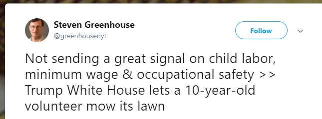 There, Steven Greenhouse, former NY Times labor reporter and author of the book, “The Big Squeeze: Tough Times for the American Worker,” tweeted that the administration was “Not sending a great signal on child labor, minimum wage & occupational safety” by having a “10-year-old volunteer mow its lawn.”