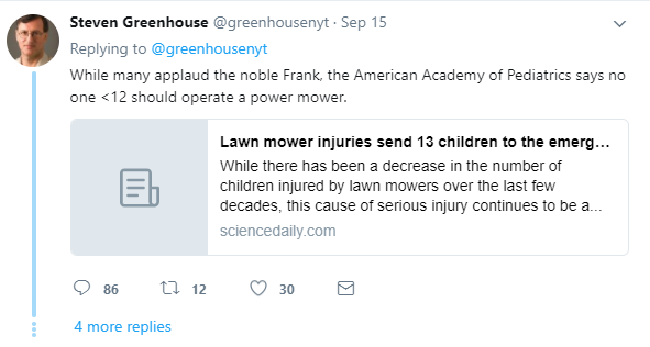 But more than that, of course, people reminded Greenhouse that it is GOOD for kids to mow lawns. Plenty of them spent their own childhoods mowing lawns. At which point, Greenhouse started recommending they all read an article on how dangerous lawn mowing is for kids: