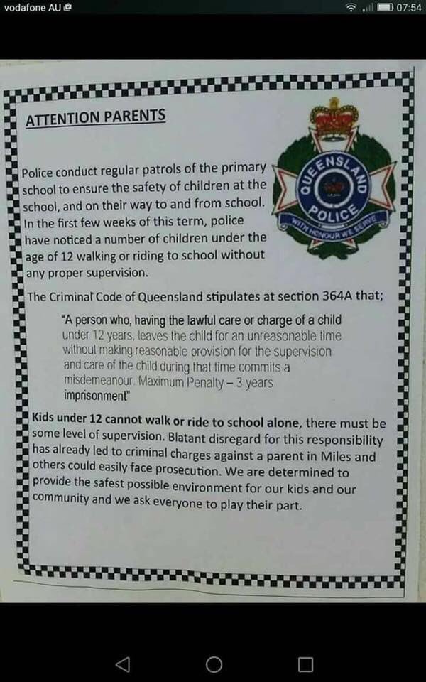 http://www.couriermail.com.au/news/queensland/do-your-kids-walk-or-ride-to-school-by-themselves-you-could-be-breaking-the-law/news-story/d45f1daefac034cb0a7aef961285c88b