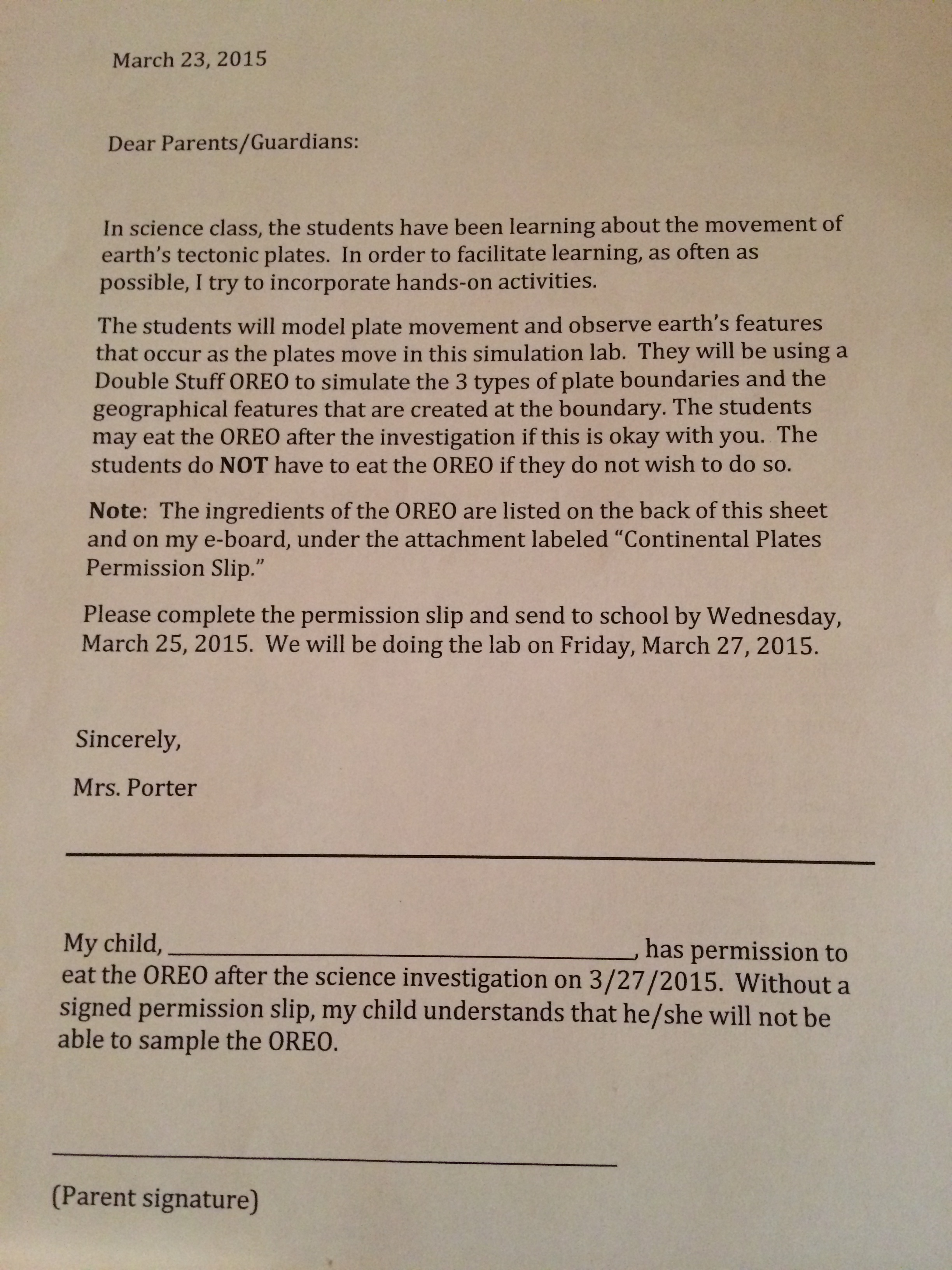 As a middle school science teacher, I use this very lab for plate tectonics. (For those who are wondering, there really isn’t another set of objects that do the plate simulation as well as a Double Stuff Oreo, I’ve tried.) I do not send home a permission slip. Our student information system lists food allergies, and I keep track of those throughout the year. I don’t use food often because it usually doesn’t have a place in the science lab, but if I do I find alternative activities that are as close to the real thing as I can make them for students who can’t do those things. I also keep track of religious materials issues, since some science materials cannot be handled by some students for reasons that have nothing to do with food allergies.