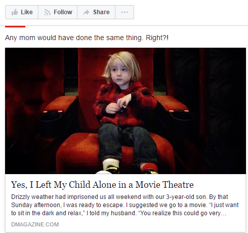 That moment was just a small part of the story, but Tim put a spotlight on it when he wrote a fantastic clickbait-y headline and subhead: “Yes, I Left My Child Alone in a Movie Theater: Any mom would have done the same thing. Right?!” While the story, which includes my email address, has not elicited a single addition to my inbox since it hit stands and went online, it did receive a deluge of negative comments when it ran on  Facebook this Sunday.
