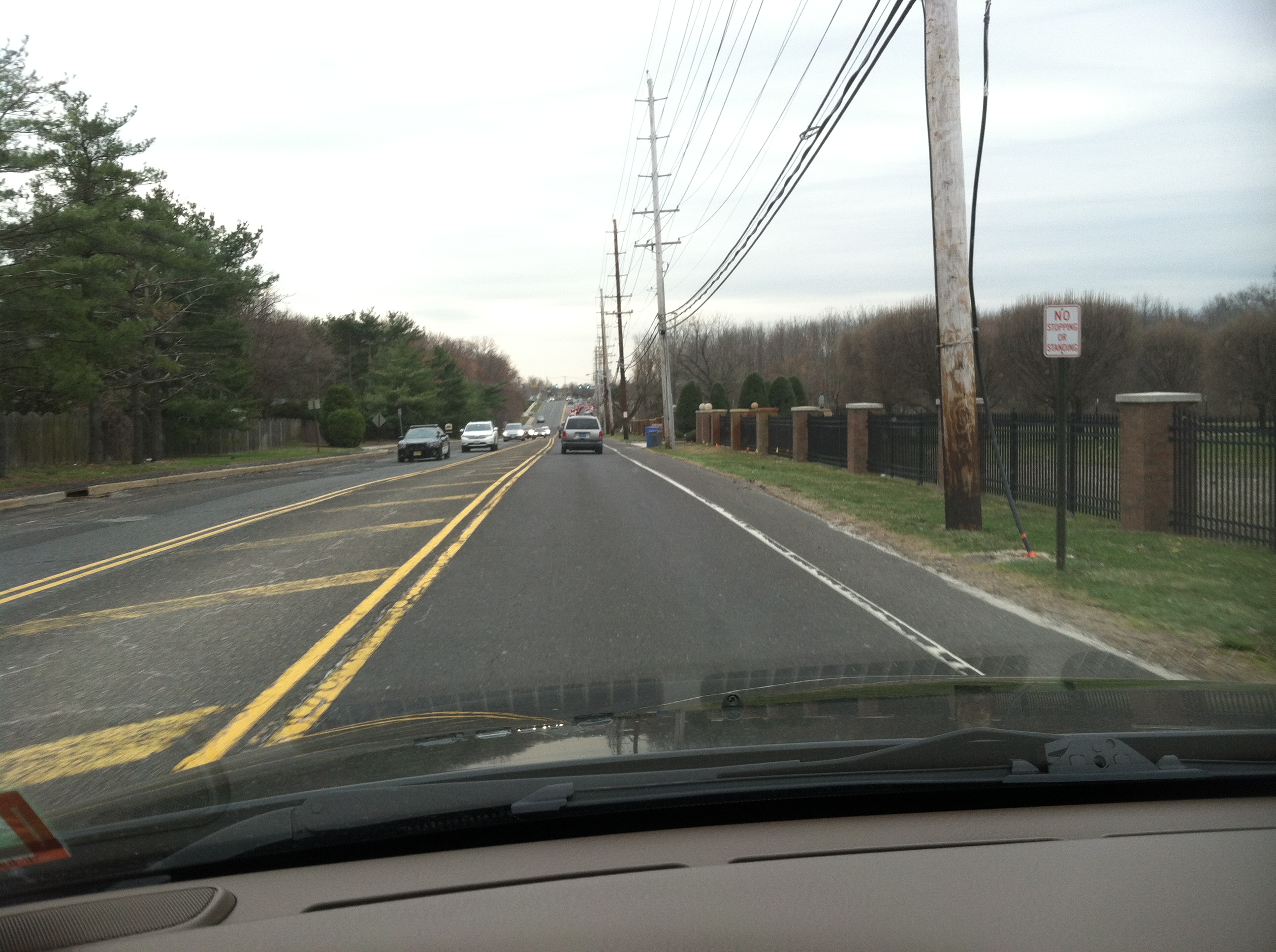 The way that WordPress formatted the photo (shot out of the front windshield of a car) does appear to make the road seem somewhat less busy than it usually is, but if you click through to the complete, original photo, it is a very good representation of Springdale road at that point along its route – about on par with the Google Maps street view photos of the same segment. It shows a road with two main traffic lanes (one in each direction) a wide asphalt shoulder to the right, with a wide grassy area beyond that. In the other direction, there is a main traffic lane and a right turn lane adjacent to a sidewalk – no shoulder, and only a 6-inch concrete curb separating the turning lane from the sidewalk.