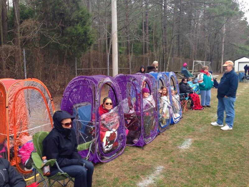 My sister lives in Washington State and they have these tents for watching games not practices. it rains so much there that they play a lot in the rain. Kids love it not so much the parents.