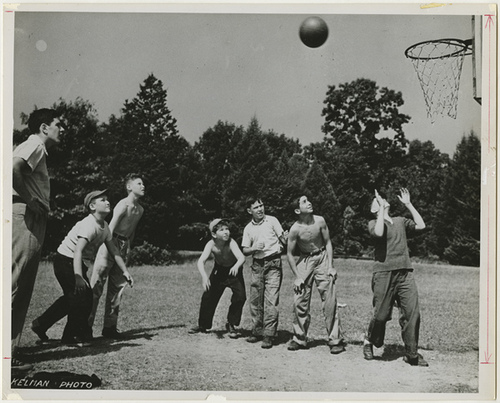Poor choice of photo to illustrate your point. There IS an adult in the picture. He is off to the left. It is a photo of boys playing basketball at the JCC, which would mean it was an adult organized and supervised game, probably played by boys who were part of a day camp, which the JCC ran to keep the boys off the street.