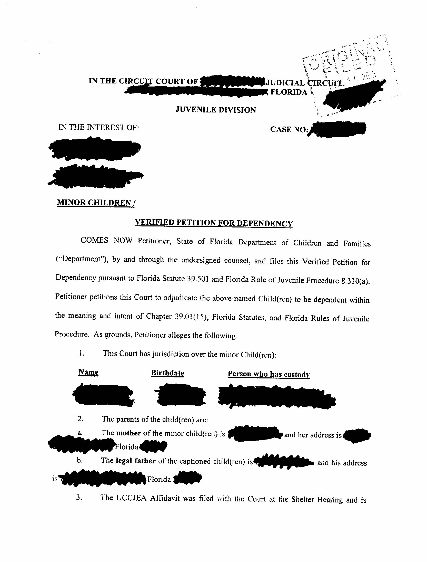 To be perfectly honest, this “proof” makes me question the story. I understand that the parents wish to protect their privacy, but with everything redacted, there is really nothing to you can discern from this document. It could be from any child abuse/neglect custody case in Florida, so long as both of the parents involved also live in Florida. I imagine that somewhere in this legal documentation, there is a narrative explaining the events that led to the children being taken into custody. If the parents have been honest in their account of events, I don’t see why you wouldn’t just post a heavily redacted page of that narrative so the documentation can be absolutely connected with the story being told here. It makes me wonder if there is more to this story. Perhaps the children weren’t just taken into custody because the older one was outside playing basketball. An investigation might’ve turned up more that the parents aren’t so willing to share. Why bother posting proof if it’s essentially just a template? I guess most people will just look at this and thing, “Looks like an official legal document to me. Must be legit!” But if you take the time to read it, it’s basically a generic page of documentation that could be about any number of cases.