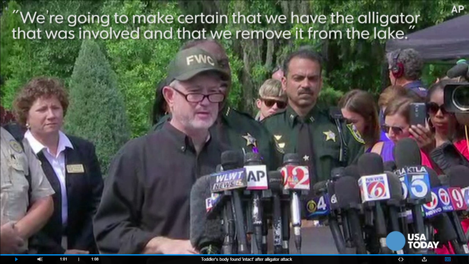 As a Florida native, this story, while tragic, is not particularly surprising. When I was in college at UF (Gators!), a student’s dog, on the leash, was grabbed from the water’s edge and eaten by a gator. Not 2 days later, I was walking past the same pond where a couple was allowing their toddler to run around at water’s edge, near the parents but not holding hands. I warned them that the pond was infested.
