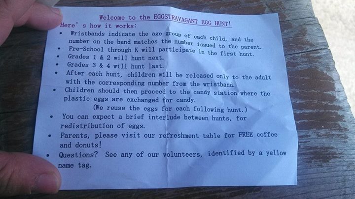 Readers — A friend who’d like to be identified only as Catherine L. posted the rules from her town’s Easter Egg hunt (above) on Facebook. These include: