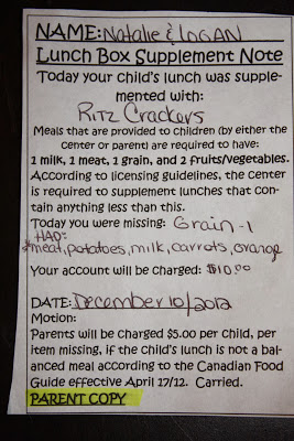 Okay–if I had to reconstruct a likely scenario here based on my own experiences I would guess that this daycare’s license to operate or accreditation by some larger body requires that they abide by the provincial nutrition guidelines. I would guess further that sometime in the recent past, the school received an inspection visit from the licensing or accreditation agency in which an over zealous inspector cited the school for failing to do this based on the a couple of not so great lunches he/she observed while there. Fearing the consequences if the inspector returned and still found the lunches not in compliance, the school instituted a policy of lunch inspection and fines. Also, they have taken the added precaution of laying in some emergency supplies that they can cram into the kid’s lunches to make sure they have all the elements necessary to pass inspection. (I’m guessing fruit roll ups, cheese sticks, etc.)