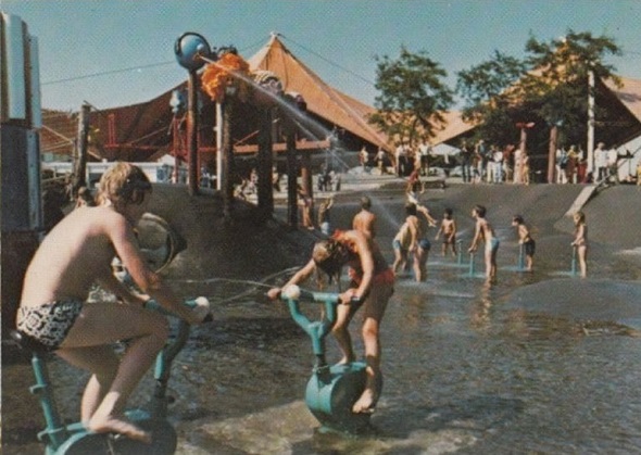 This is the grooviest video! I highly recommend watching it and appreciating an awesome play area that once was loved by kids, like an extinct playground. I especially enjoyed the water-penis squirting bikes…and the kid who fell fully clothed into a water feature under a zip line. He’s probably the kid that designed water shoes for modern day water parks. This is one very cool park!