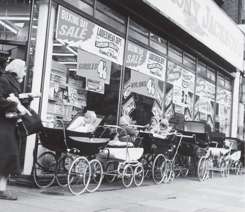 Here’s a photo from Britain, where it was once absolutely common to let your kids wait in their buggies while you went shopping.