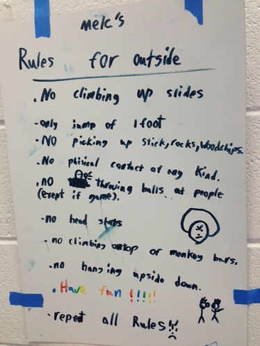 I love that the kids are involved in the making of the rules. As an elementary school teacher, these rules look organic- as if they have arisen from actual problems. They all look pretty reasonable to me, especially if they were agreed upon. “Only jump off 1 foot” might mean an apparatus that’s OK to jump off. Maybe the rest are too high for jumping with that many kids on the playground. Rules for the playground when you take a few kids are different than the rules when you have a hundred kids outside with four monitors. Climbing up the slide results in fewer kids being able to go down. It’s less about safety and more about keeping the flow going. I’m glad to see that “No running” is not on the list as it is on more and more school playgrounds.
